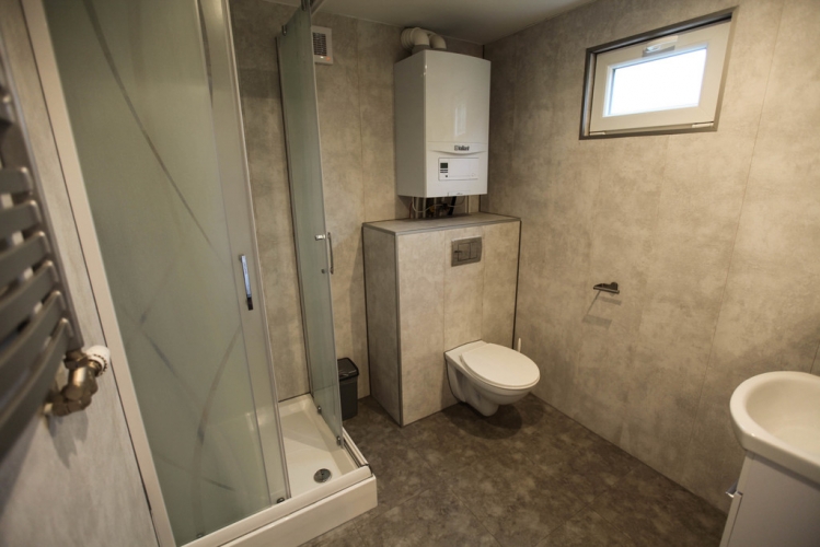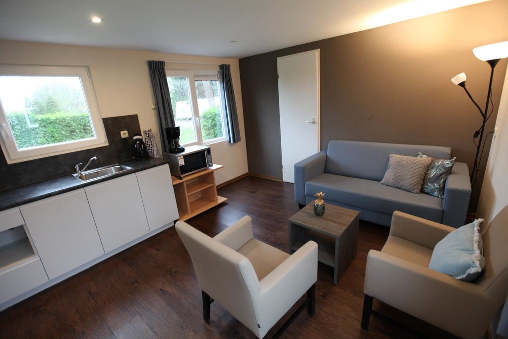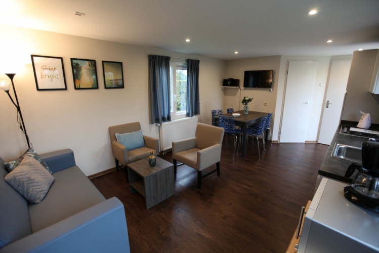 - Open keuken met 4-pits gasfornuis, koelkast met vriesvak, koffiezetapparaat, combi magnetron en waterkoker