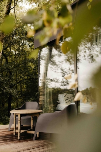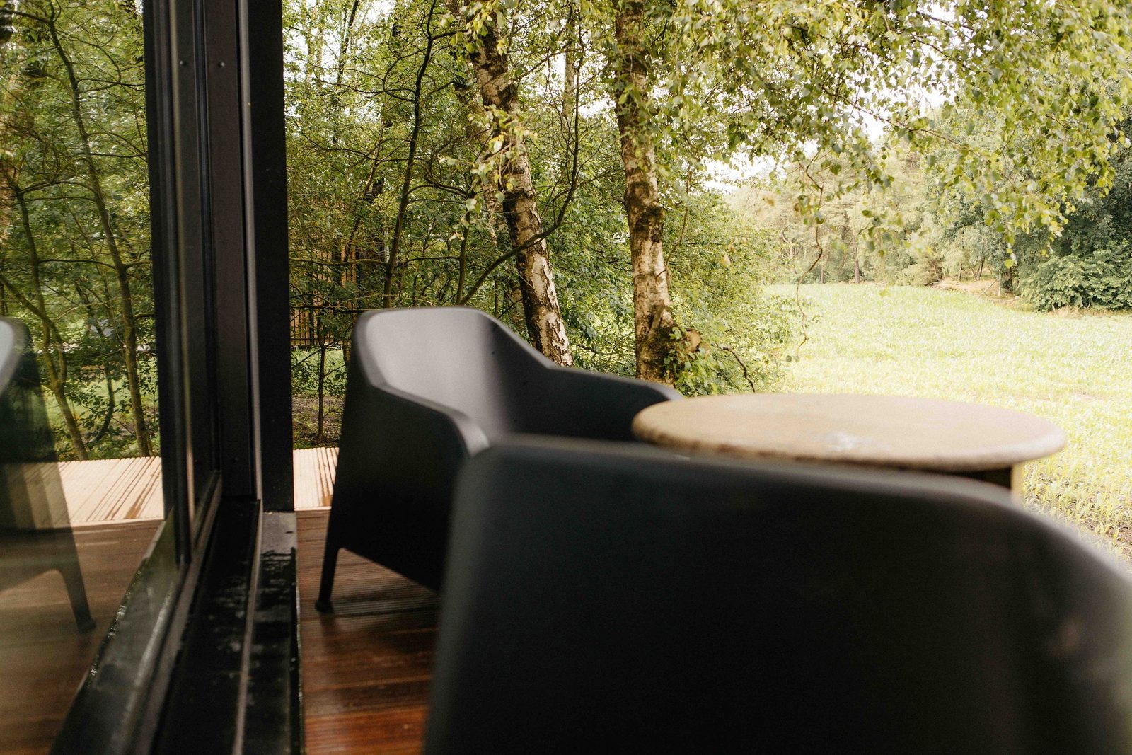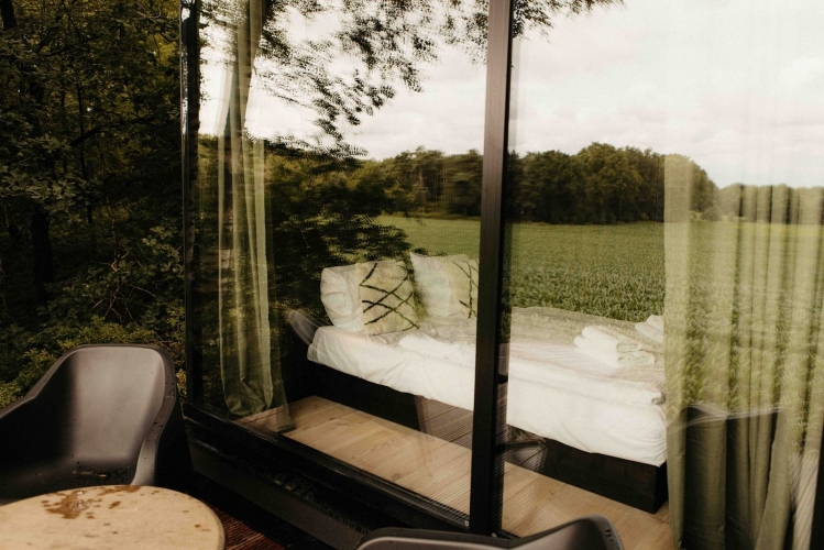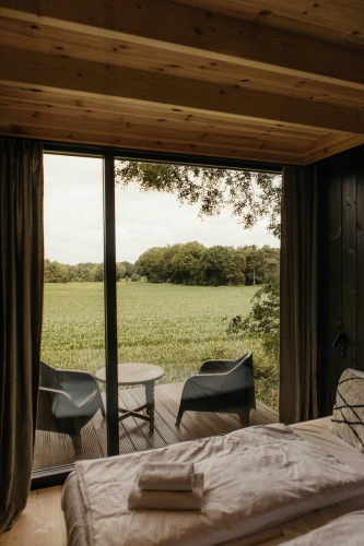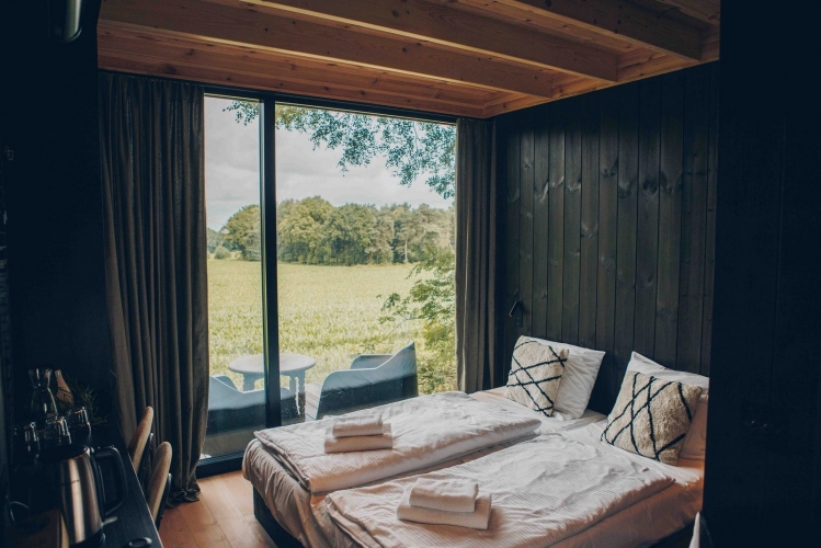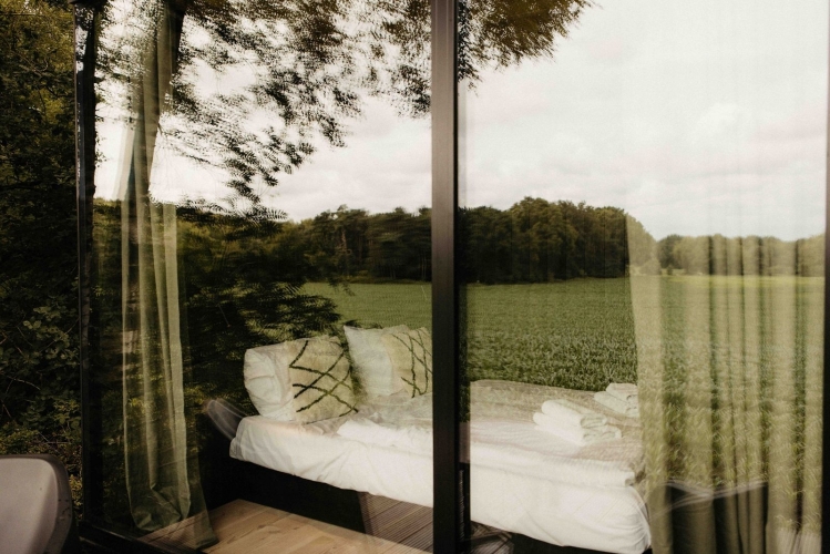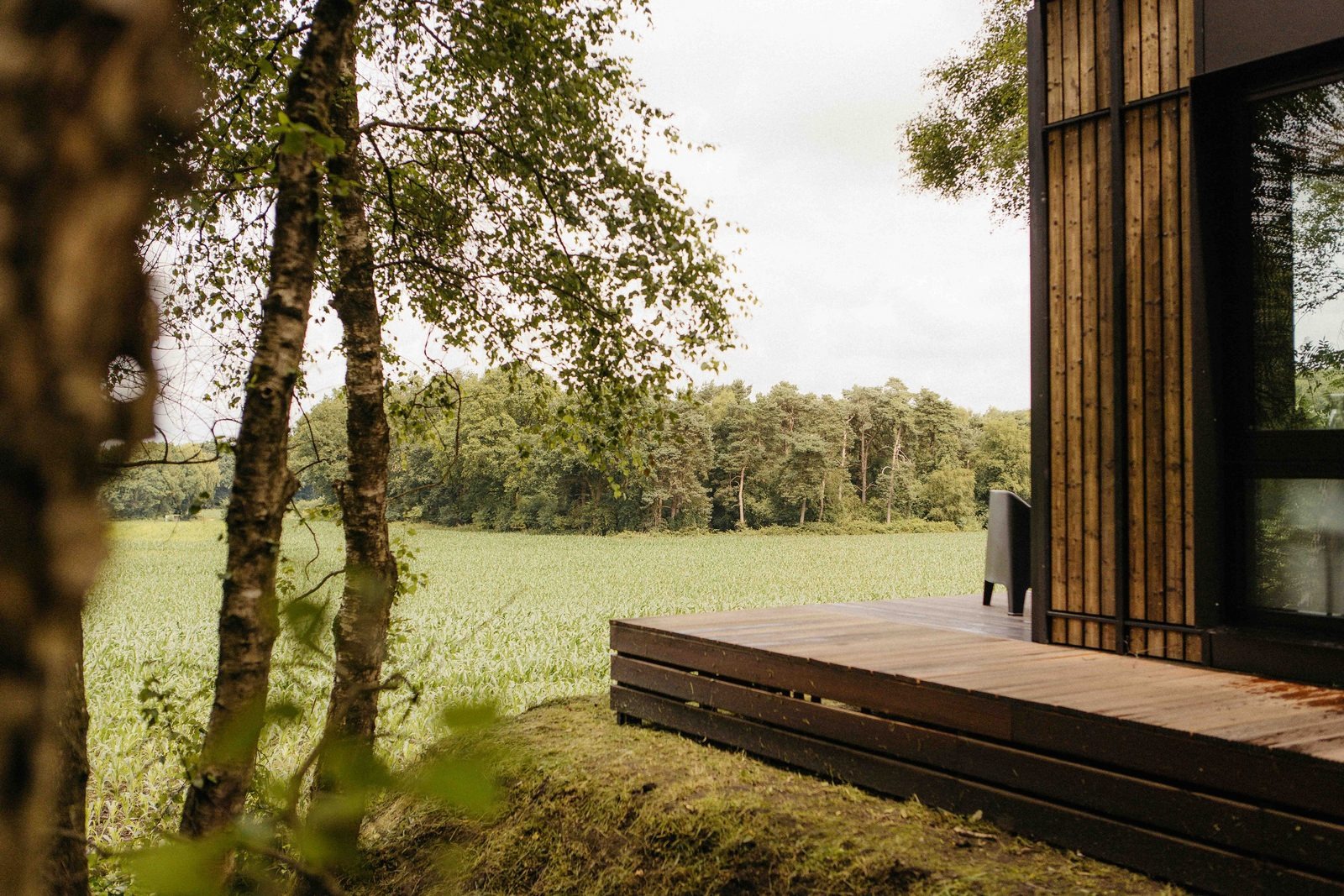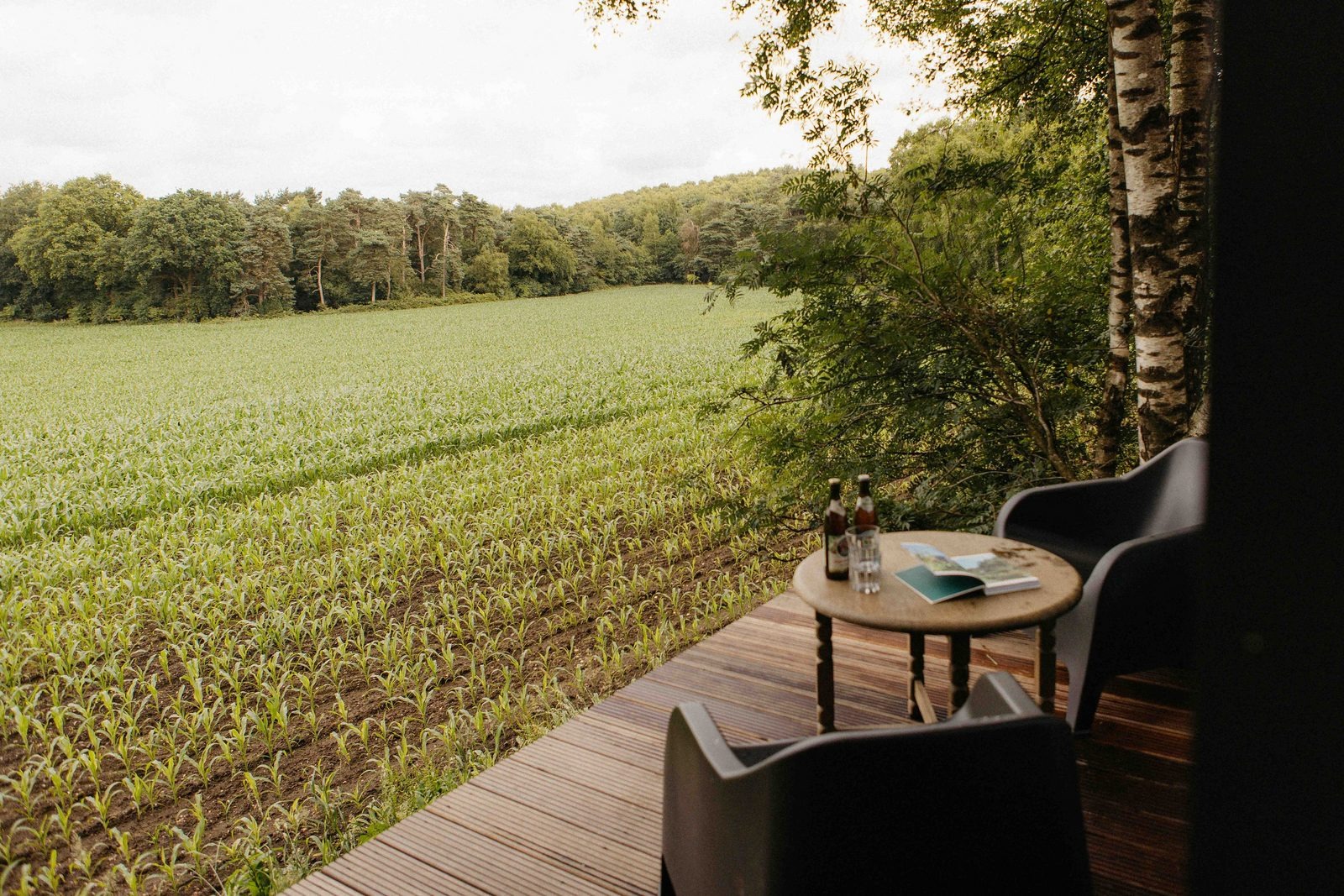 De cabin ligt aan de rand van het bos met direct toegang tot de paden. Door de unieke ligging geniet je van optimale privacy en weidse uitzichten over het glooiende landschap. Vanuit bed kijk je uit op de ondergaande zon boven de uitgestrekte velden.