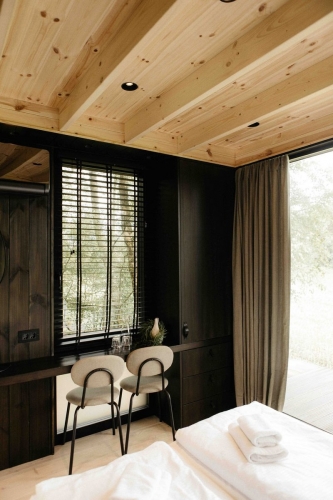 Deze compacte cabin van 18 m² is slim ingericht als een luxe microhotel suite. De robuuste buitenkant contrasteert prachtig met het stijlvolle interieur, waarin comfort en natuur samenkomen.