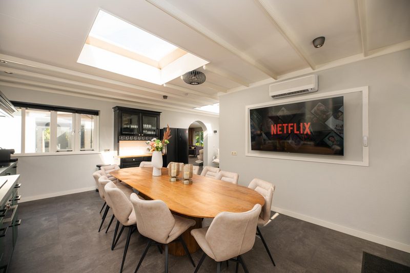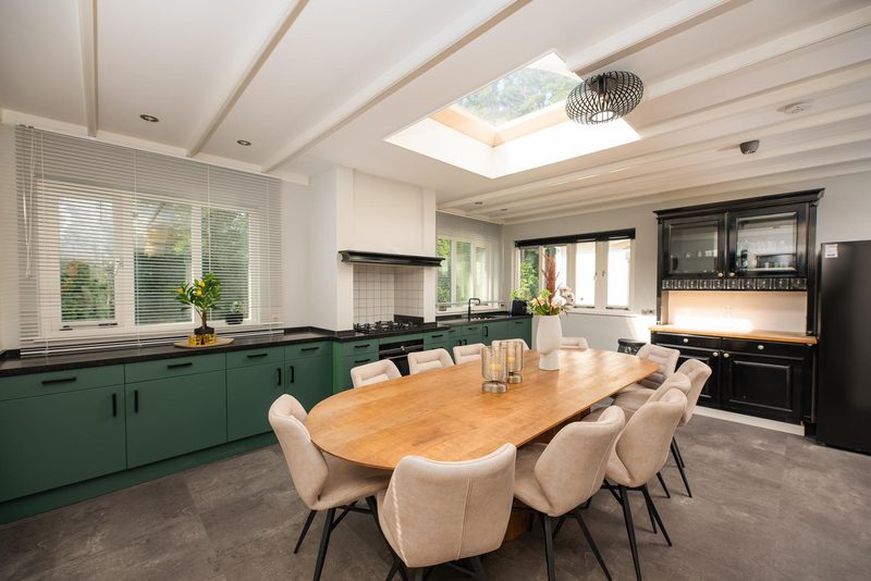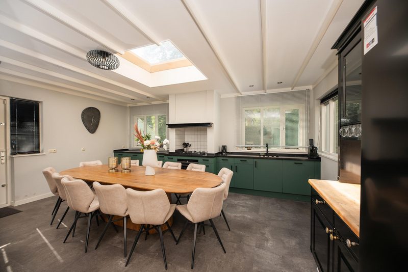 De grote keuken is volledig uitgerust met alles wat je nodig hebt om de heerlijkste maaltijden te bereiden. Van een 6-pits gasfornuis en combi-magnetron tot een heteluchtoven, vaatwasser, koelkast met vriesvak, Nespresso koffiemachine en Quooker waterkoker — de keuken biedt alle moderne gemakken. De ruime eettafel is de ideale plek voor het samen delen van maaltijden, met voldoende ruimte voor de hele groep om gezellig aan te schuiven.