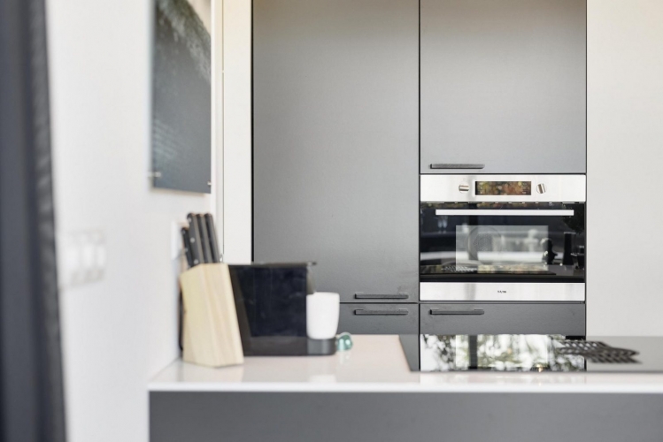 In het woongedeelte bevindt zich een stijlvolle zithoek en een moderne open keuken, volledig uitgerust met Nespresso-apparaat, waterkoker, combi-oven, koelvriesvak, inductieplaat en een kookeiland met geïntegreerde afzuigkap.