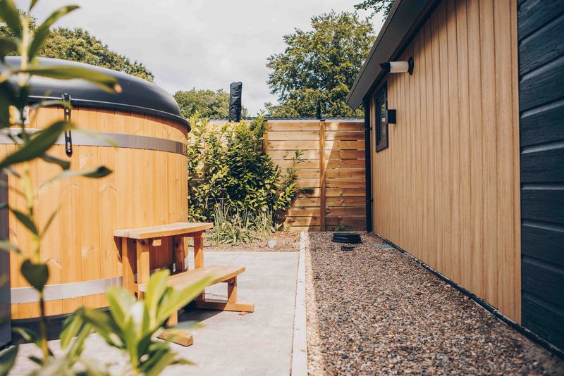 Buiten vind je een uitnodigend terras met comfortabel terrasmeubilair en een relaxstoel, perfect om te ontspannen met een kopje koffie in de ochtendzon of een glas wijn bij zonsondergang. Het absolute hoogtepunt van deze accommodatie is de heerlijke privé hottub in de tuin, waar je volledig tot rust komt, omgeven door de serene schoonheid van de natuur. Dit biedt de perfecte afsluiting van een dag vol avontuur of een rustig moment van ontspanning.