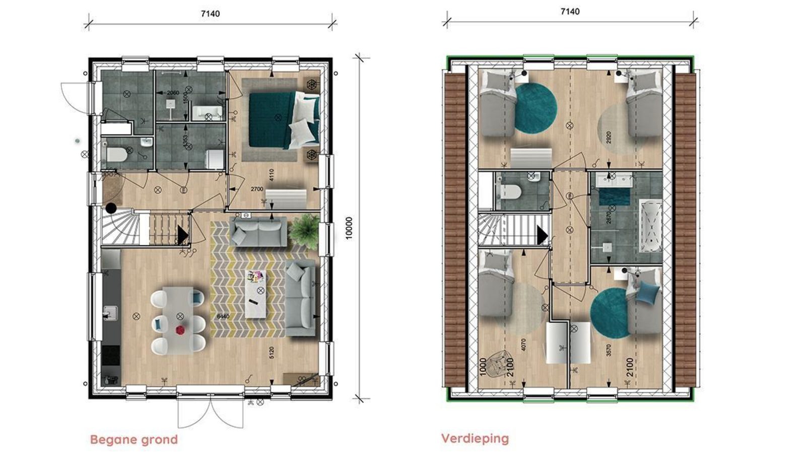 • 2 slaapkamers met elk twee boxsprings (2x 90x200 cm) op de eerste verdieping